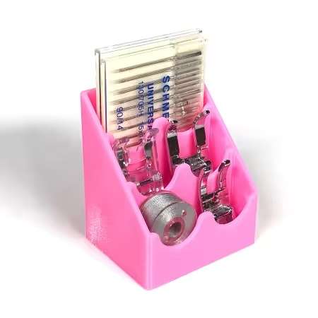 Keep your most used notions close by with Cat’s Cradle. Cheryl from The Yankee Quilter asked me to design a product that could keep her snap-on feet organized while she worked on a project that required switching between several different presser feet. Together we created Cat’s Cradle to hold your most used notions: snap-on presser feet, needles and Class-15 bobbins. Cat’s Cradle has three slots that can hold up to 6 snap-on presser feet, or store up to two packs of needle per slot, or two Class-15 bobbins per slot. We included an adhesive patch to adhere Cat’s Cradle to your sewing machine (the adhesive is removable and leaves no residue) but it’s also short enough that you can store it under your Sew Steady table so it’s within reach but out of the way. Package includes one Cat’s Cradle and one adhesive patch. Designed and 3D printed in the USA by Purple Hobbies LLC.