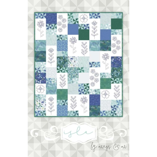 his quilt combines pinwheel piecing with bluework floral embroidery for a clean, classic look. Also available in machine embroidery. Finished size: 48″ x 57″