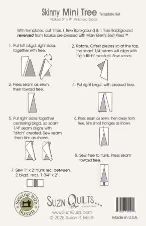 I’ve done it again, designed yet another tree template set to make more adorable trees! I think these trees will steal your heart like they’ve done mine! Skinny Mini will make trees to match the height of my Mini Trees, the largest size of my tree template sets, yet they’re only as wide as my Tiny Trees. If you add trunks as described in the included instructions that come with each set, they will measure 3″ x 9″ finished, BUT I’m already designing more than just trees with them! As with all of my tree template sets, just cut strips of fabric as